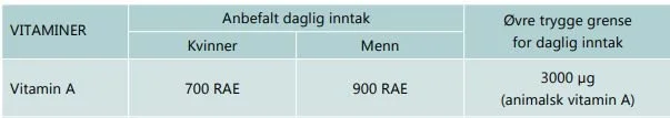 (RE: Retinolekvivalenter, ikke medregnet karoten og andre karotenoider.)